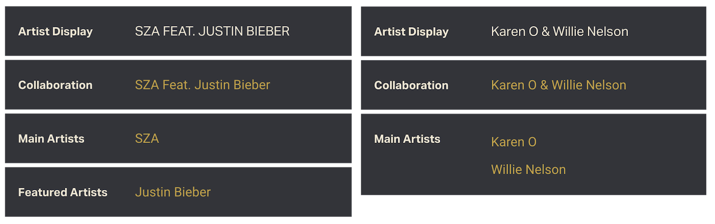 Release Group metadataRelease Group Dashboards display the following metadata categories.Luminate IDOur unique identifier for the release group (note that the Luminate ID is part of the URL)Title and Artist DisplayOfficial title and credited artist for the workCollaboration, Main Artists and Featured ArtistsIf a release is credited to a multi-artist collaboration, these fields indicate the nature of the collaboration and the role of each artist. Some collaborations credit the artists as a unit, some credit artists equally and some designate one Main Artist.Release DateDate of initial album releaseImprintPromotional labelDurationTotal length of the albumGenresMain Genre and any additional genresRelease TypeUsually album, EP, single or video release.LanguagesAll languages used on the albumCompilation TypeIndicates whether a release is a compilation (containing tracks from multiple albums or artists) and if so, what kind.Release and Product metadataRelease and Product-level Dashboards have additional metadata categories:Parental WarningExplicit content labeling, if applicableProduct FormatDigital, Vinyl, DVD, etc. Format options change based on release type.