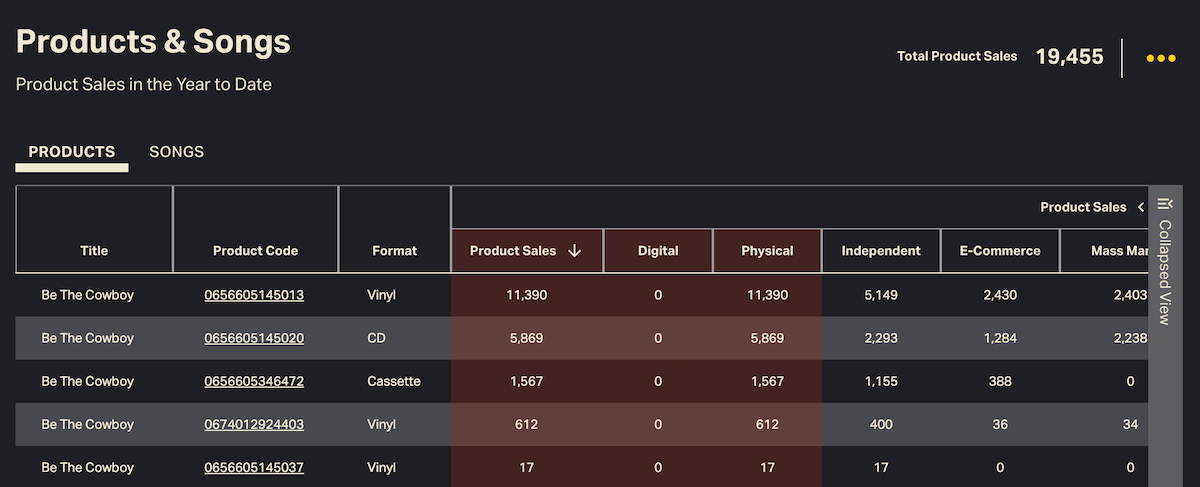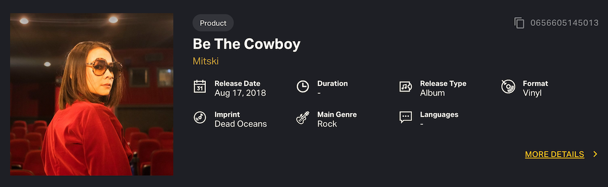 At the Product level, you can differentiate between individual barcodes (ICPNs). Most Releases are sold in more than one format: CD, vinyl, digital album, retailer exclusive, alternative cover art, limited-edition colored vinyl, et cetera. Each of these is its own Product.