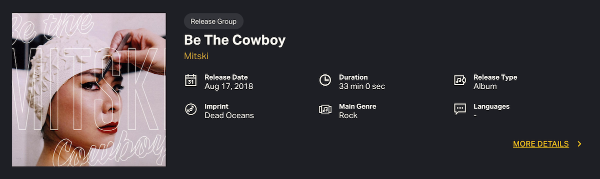 The top of a Release Group Dashboard displays key identifying information for an album or product. Click MORE DETAILS to see additional metadata. Release Group, Release and Product Dashboards contain different metadata fields and attributes.