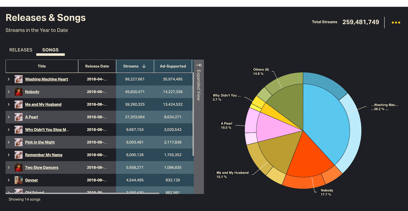 Scroll to the bottom of a Release Group Dashboard to drill down deeper at the song or album level. Toggle between SONGS and RELEASES to see ranked lists of songs or album editions (Releases) based on consumption. Top songs for a Release Group will appear at right as a pie chart.