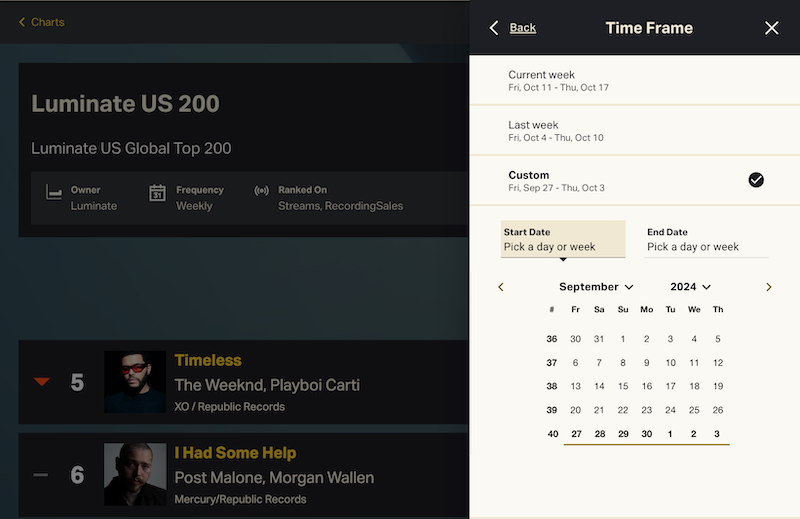 You can only view one chart at a time. If you want to combine multiple chart weeks or replicate a chart not found in our database, build a custom Ranking Report.