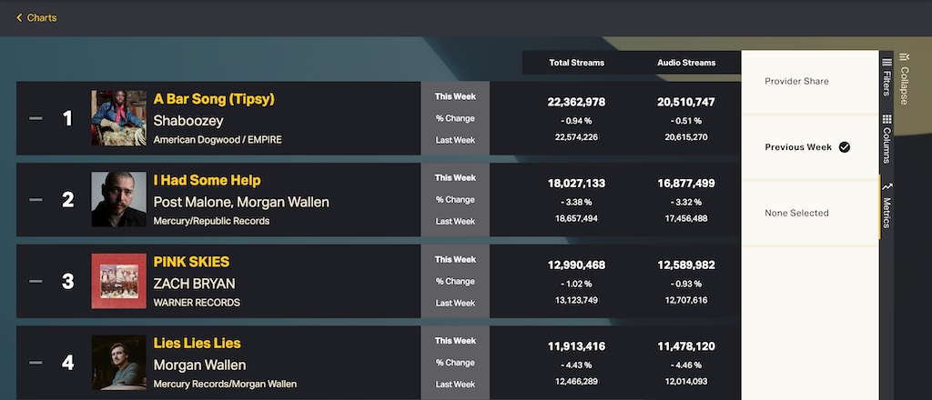 Adjust grid view options from the menu bar to the right of the full chart. You can filter chart entries by genre or label, hide/show columns or turn on metrics for week-over-week % changes.