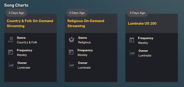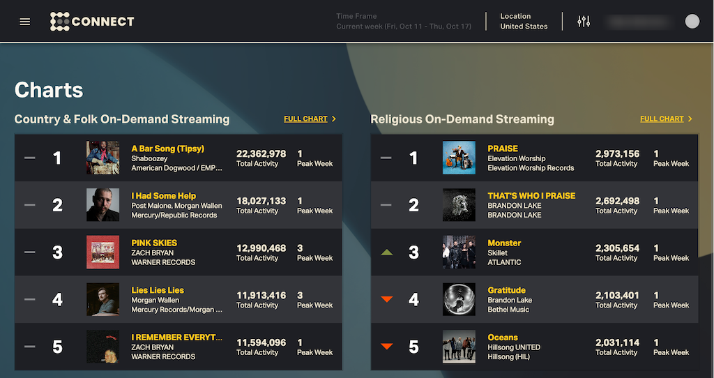 Luminate partners with over 500 data providers to create the music industry’s most widely-referenced charts, including the Billboard 200 and Hot 100, global hits and genre charts. CONNECT includes access to not just the charts, but the numbers behind the rankings.