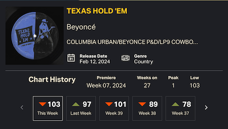 Scroll the chart at the left of the page to see all entries. Click any entry to see a breakout pane that lists its last 5 chart positions, up or down trends and chart history. Click artist names or titles to visit those Dashboards.