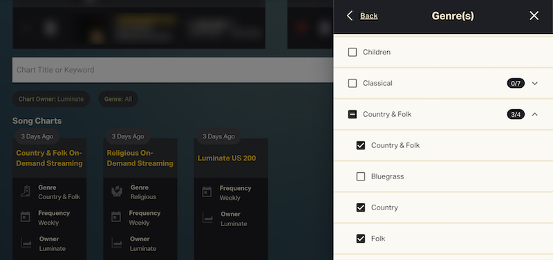 Genre lists will change depending on your selection for Chart Owner (Billboard or Luminate). You can only search one genre list at a time.Billboard and Luminate genres are slightly different. If you’ve selected Chart Owner > Billboard, the available Genre Database options will automatically default to Billboard; same goes for selecting Luminate.