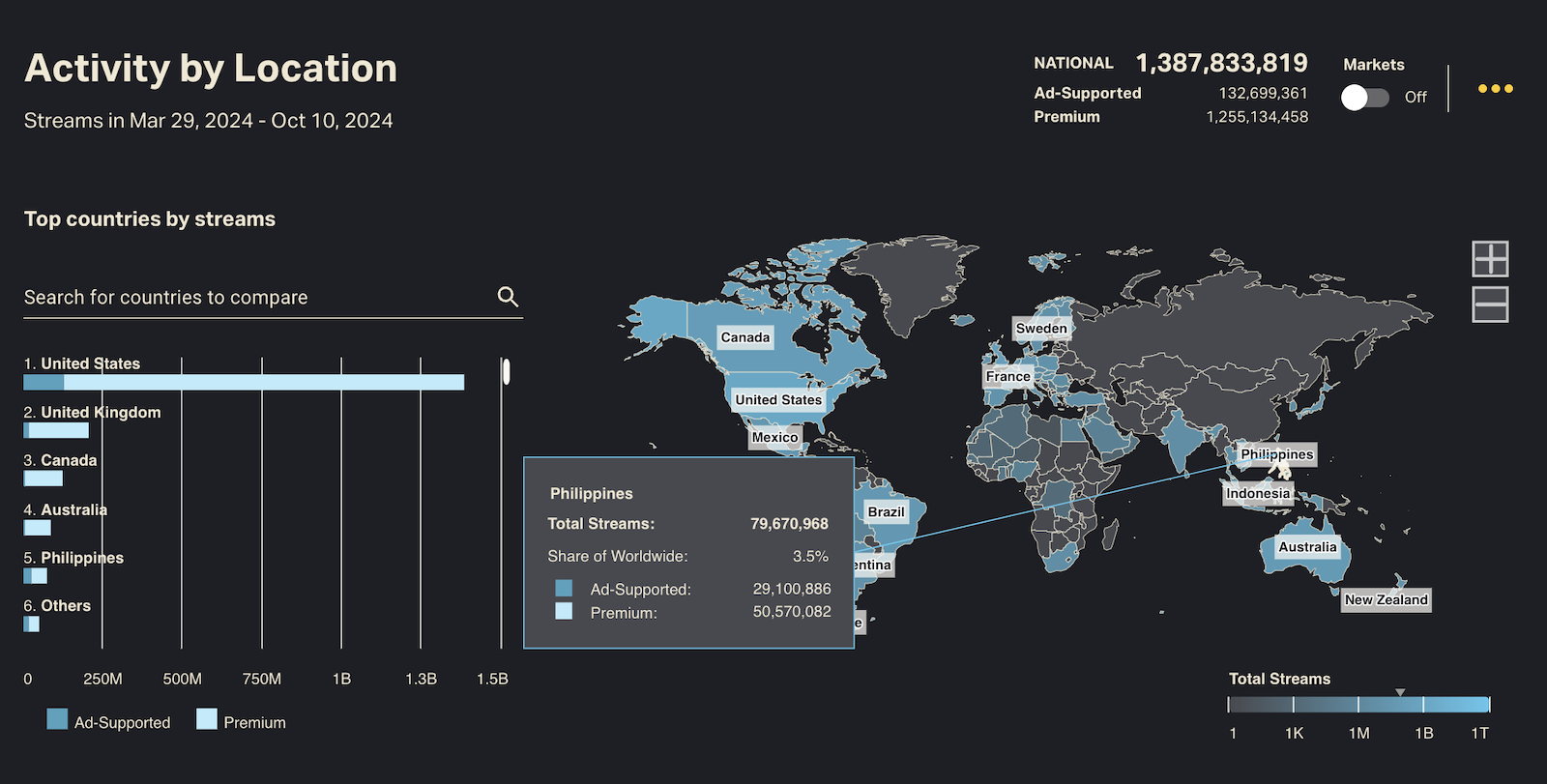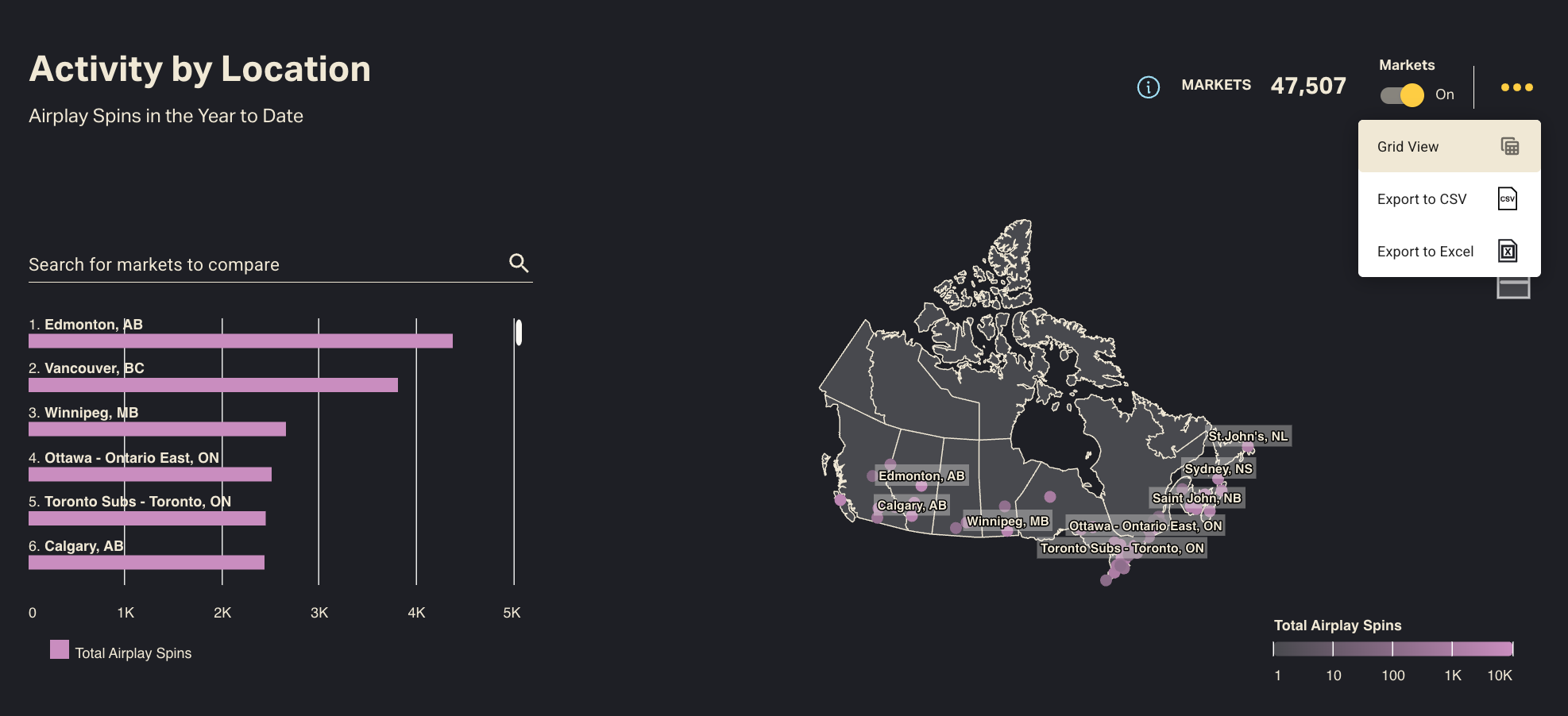 Go to any Artist, Album or Song Dashboard. Set your desired parameters and adjust view options to customize Activity by Location.
