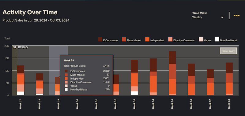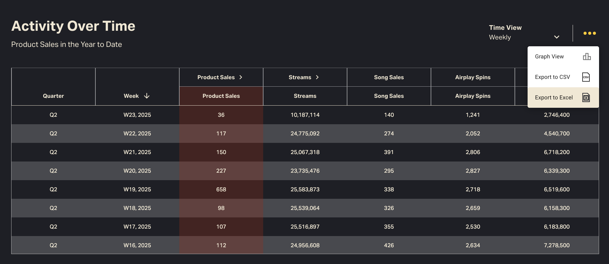 On all Dashboards, Activity Over Time shows consumption at the daily or weekly level during your selected date range. It provides a useful snapshot of artist, album or song performance within a given activity.