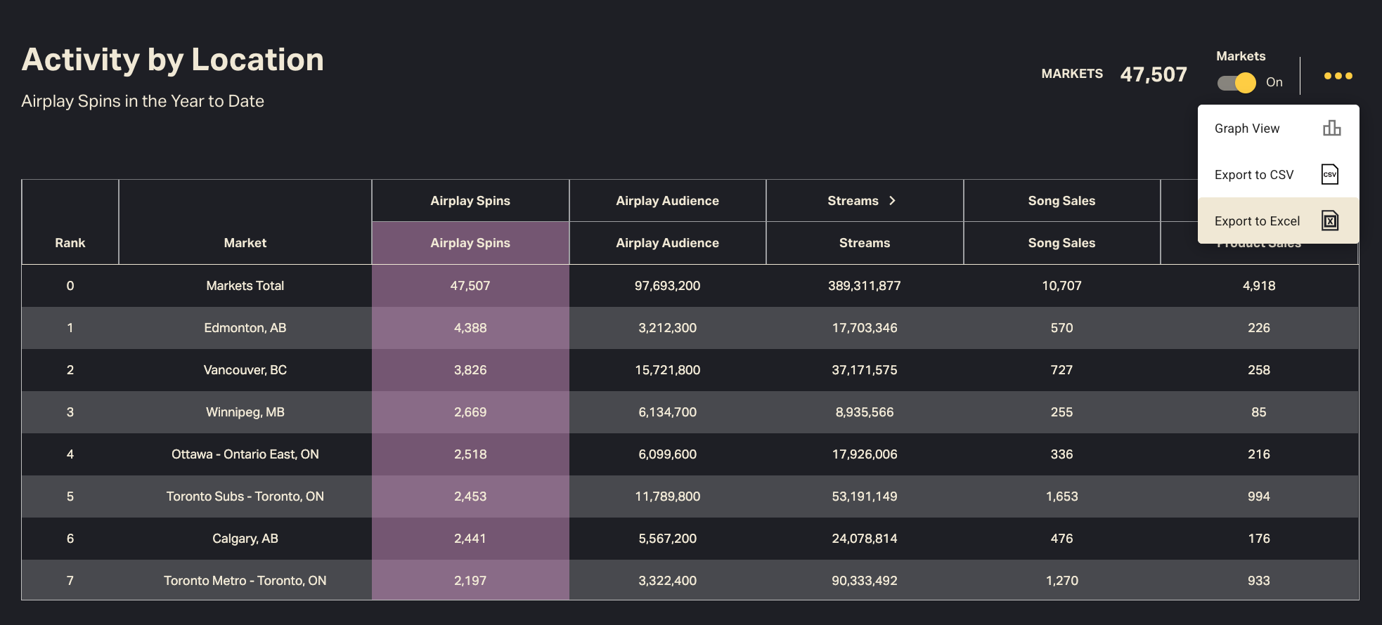Start with Dashboard data—especially Activity by Location—to understand consumption at a global, local or market level for specific artists and products.