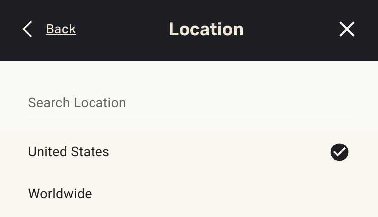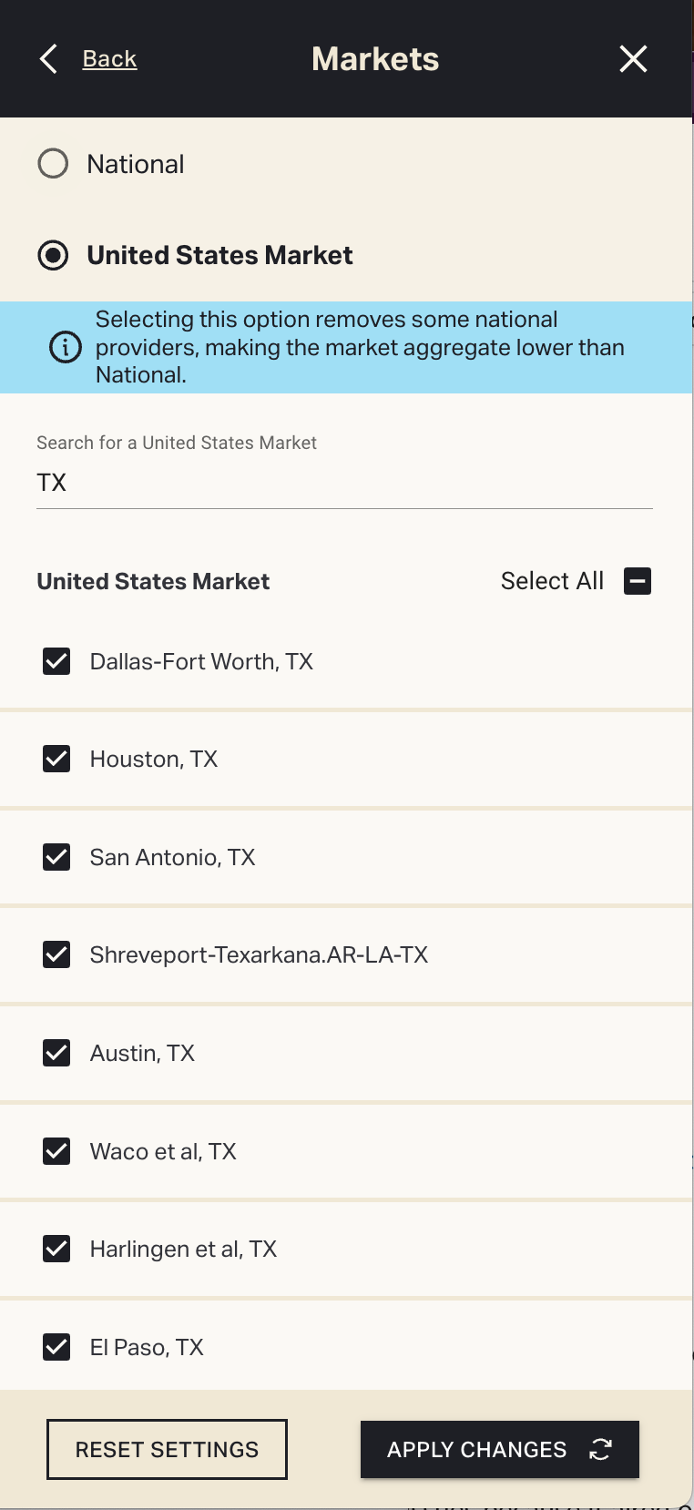 Go to any Dashboard. From the top menu bar, open the Location dropdown and choose the United States or Canada. Then use the Markets menu to make additional selections.