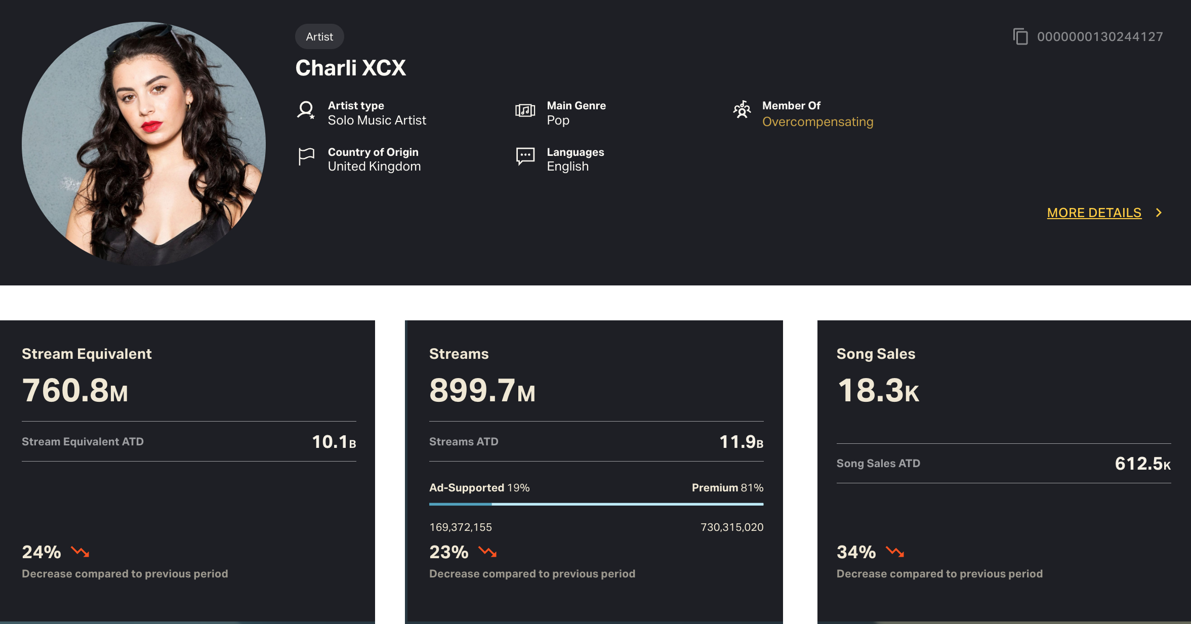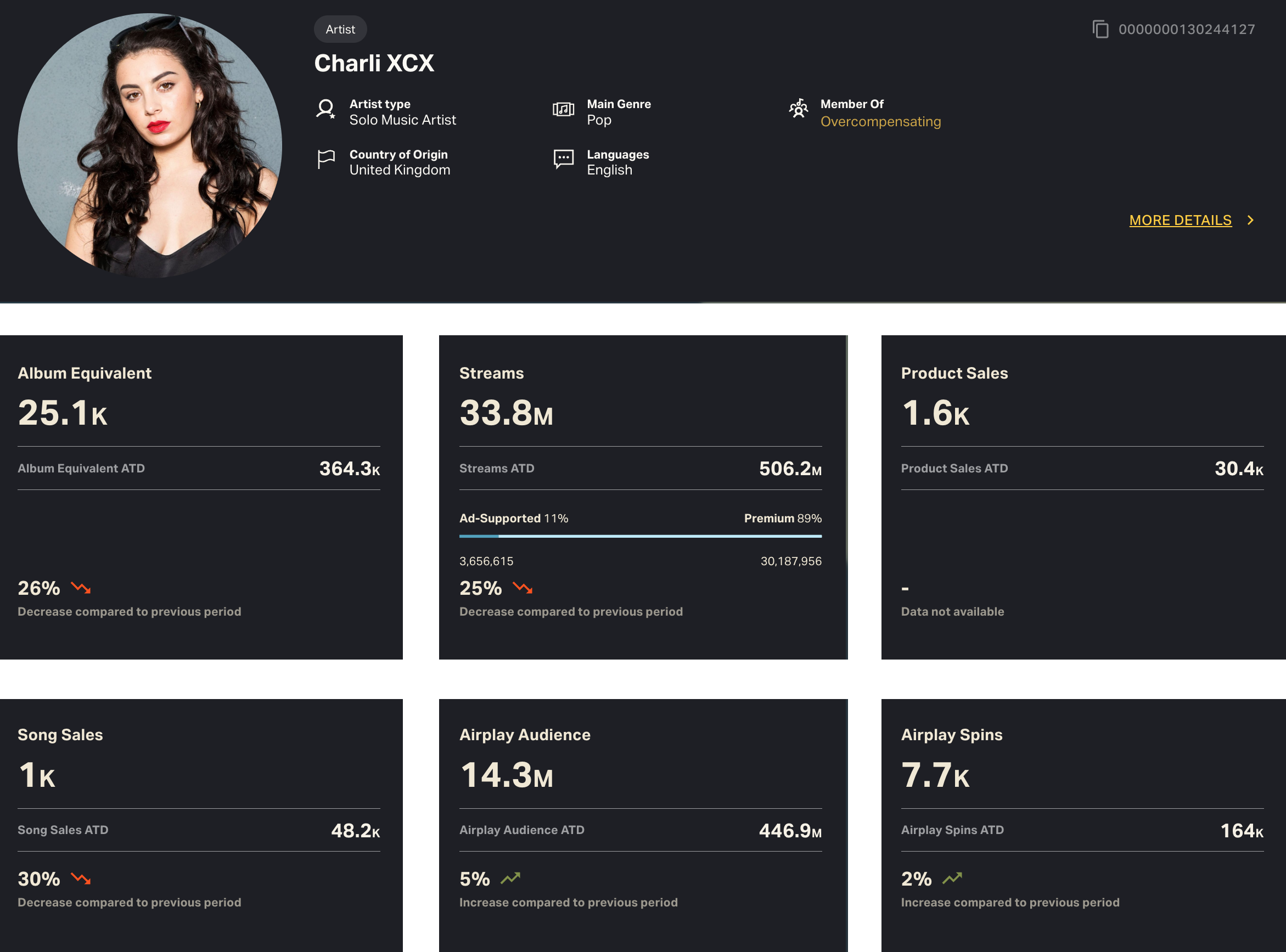 At the top of every Dashboard, a fixed pane lists standard identifying information.Artist Details: Key metadataClicking MORE DETAILS opens additional tabs of information for each Dashboard entity. The leftmost DETAILS tab lists metadata related to artist, genre and format (if applicable).External IDs: All identifiersThese are unique alphanumeric codes used by different providers and databases to identify and track artists, albums and songs. We also attach a Luminate ID to each musical entity. Use Luminate IDs or external IDs for precise searching or cross-referencing.See an example: Release External IDsLuminate IDs are in the leftmost DETAILS tab. All other ID types for an entity are listed under EXTERNAL IDS.