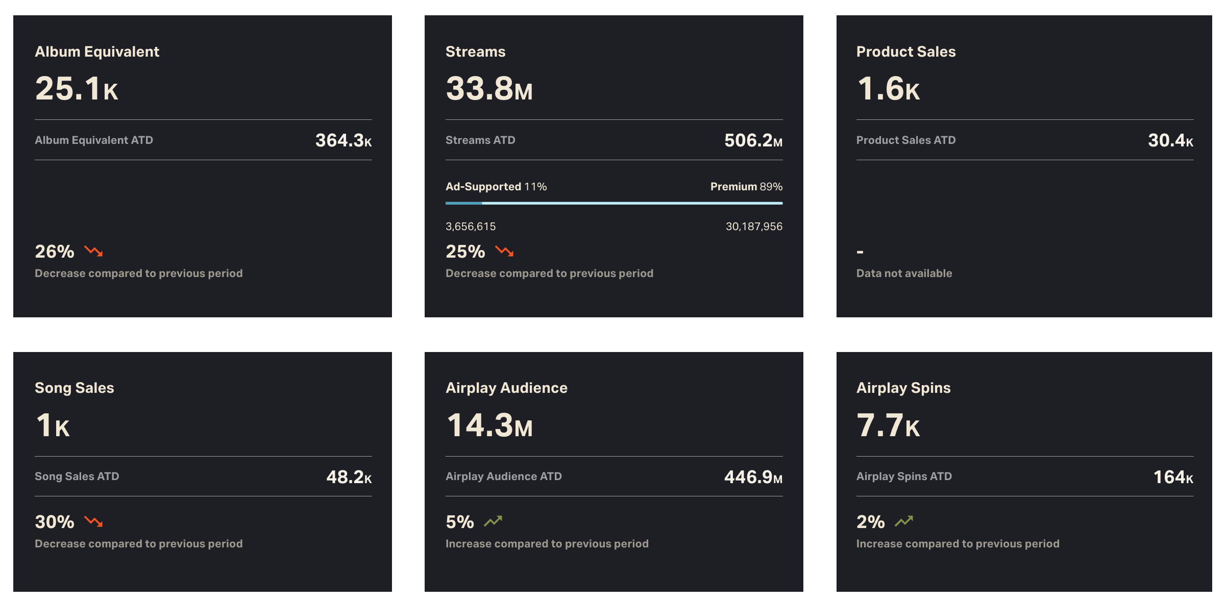 The next two rows summarize key performance indicators (KPIs): Equivalents, Streams, Song Sales, Product Sales, and Airplay activity.
