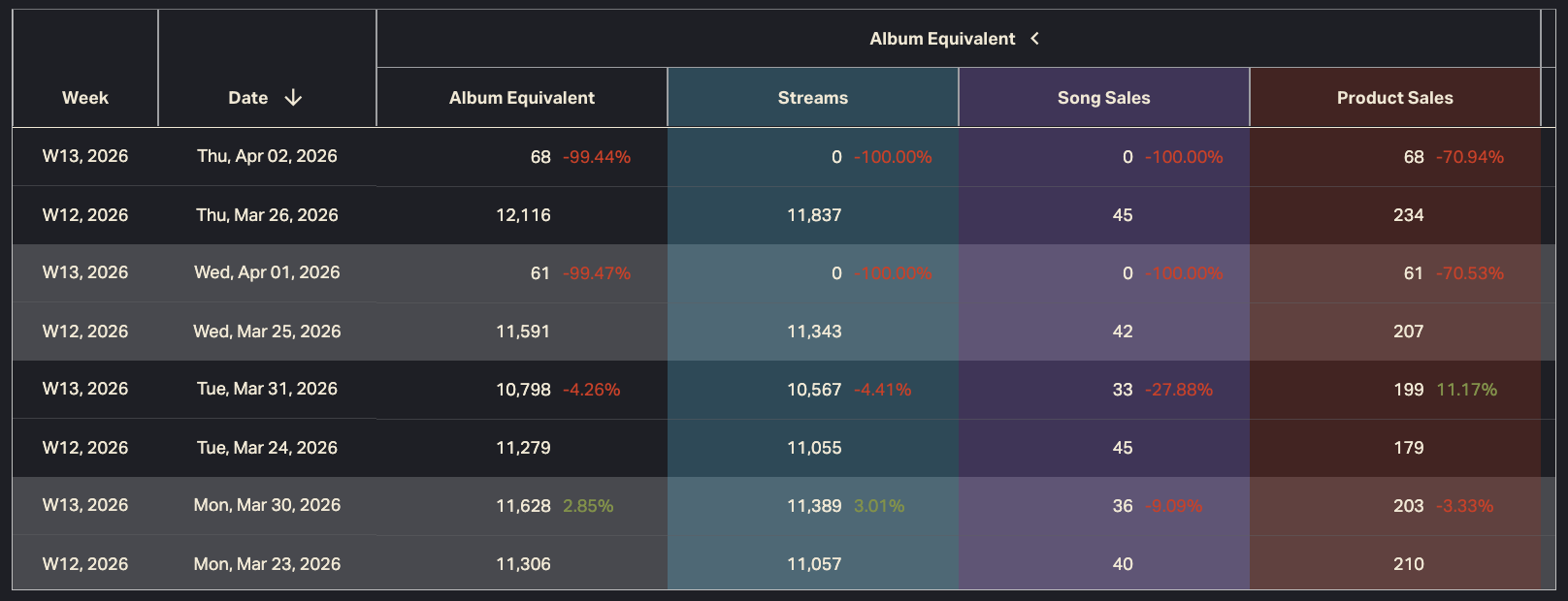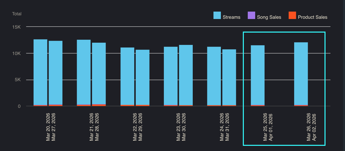 Streams are blue.Song Sales are purple.Product Sales are orange.Airplay Spins and Airplay Audience are pink.