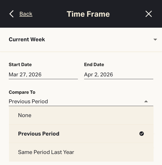 Time Frame, Location and Activity Type can be set from the the top menu bar. Clicking these fields may open menus as either dropdowns or overlays.