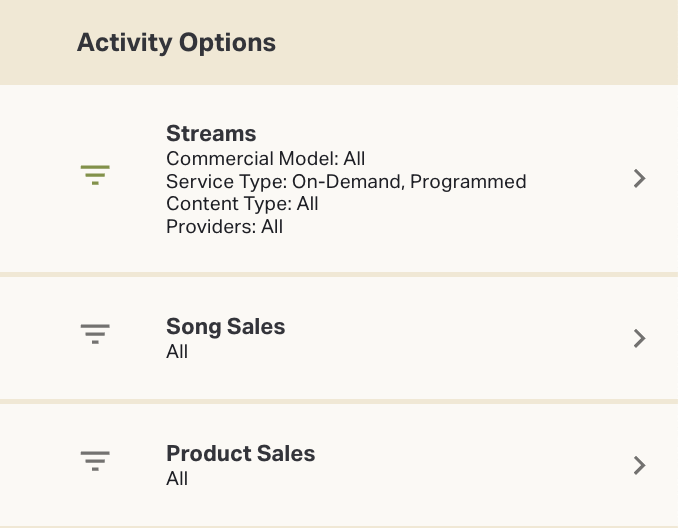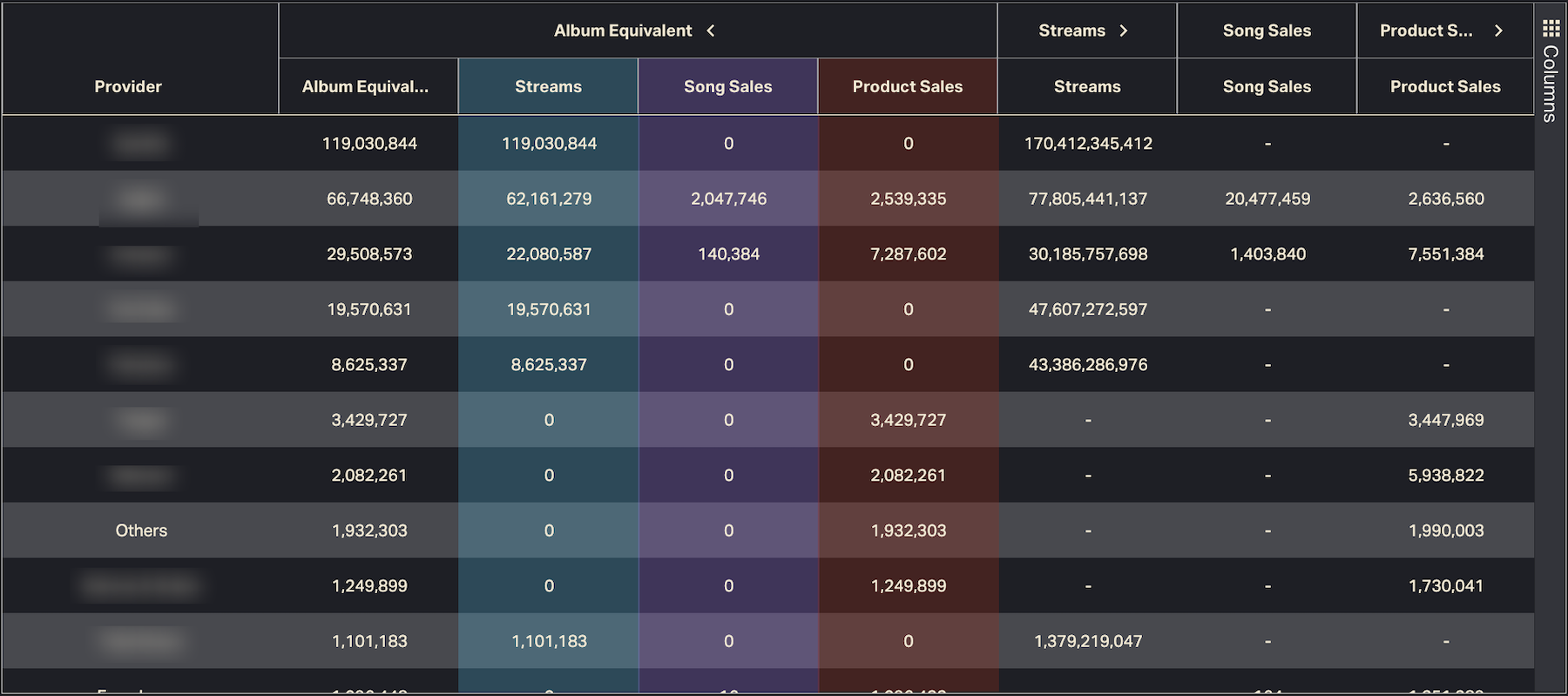 Providers comprise streaming DSPs as well as digital and physical retailers. Provider-level activity is not available for every account type.