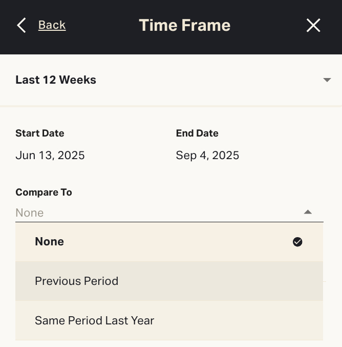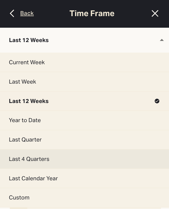 The Analysis Time Frame menu contains different options than you’ll find elsewhere in CONNECT. Click Time Frame in the top menu bar to open the calendar tool.