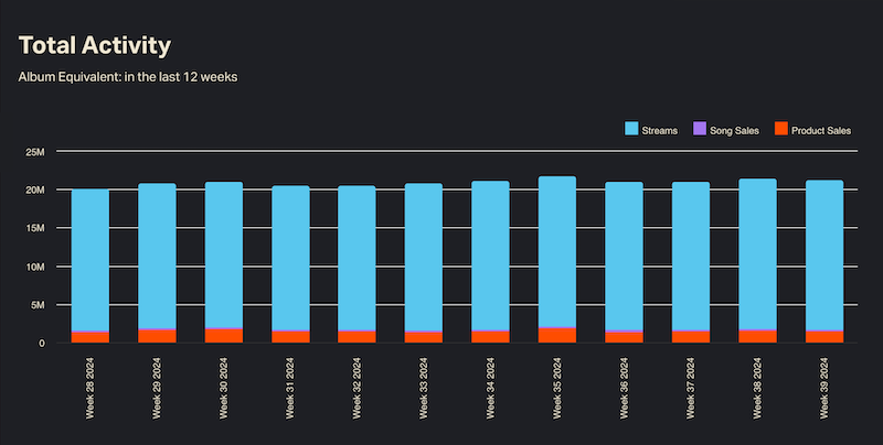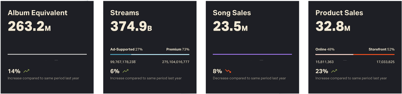 Every Analysis tab leads with KPI highlights at the top of the page: Album or Stream Equivalent, Streams and Song Sales. A fourth KPI, Product Sales, is available in the U.S. and Canada.