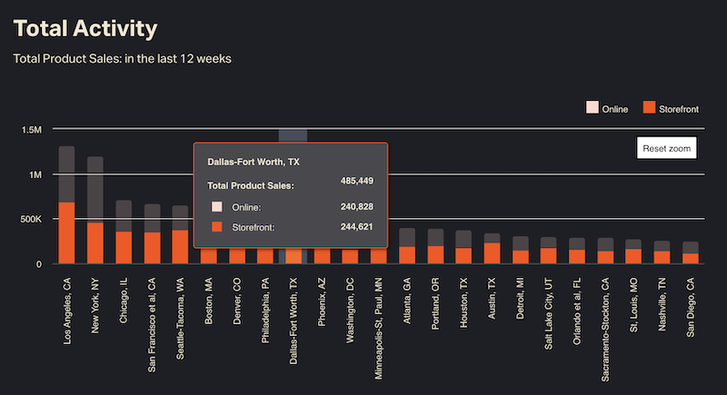 These are combined totals for your date range. Set a Breakout View to see splits for some categories. If you make a selection for Time Frame > Compare To, the KPI panes will also display a % increase or decrease.