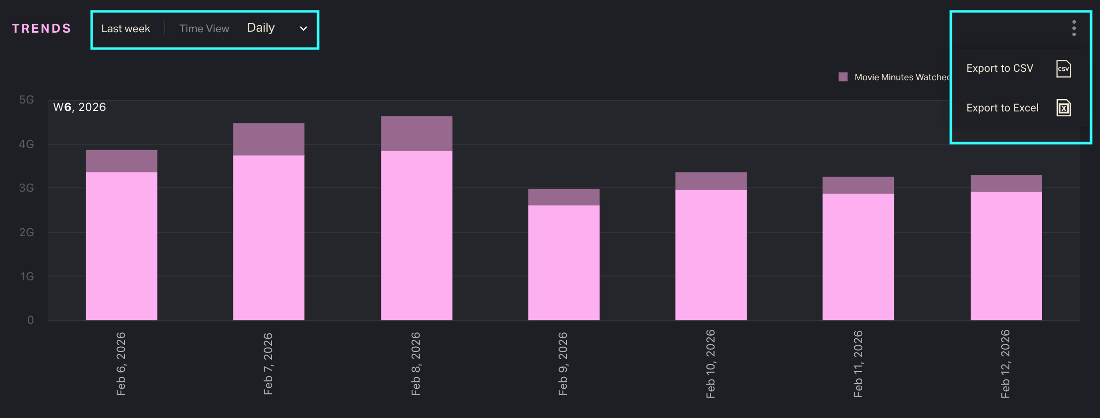 The bottom of the All Streamers Dashboard displays daily or weekly aggregated activity for the selected time frame. Click the … menu at top right to export Trends data in CSV or Excel format.