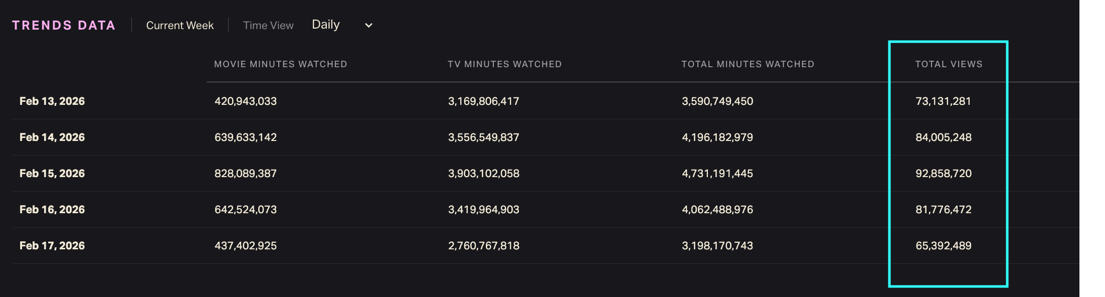 The TRENDS DATA grid lists daily viewership figures as well as Total Views.