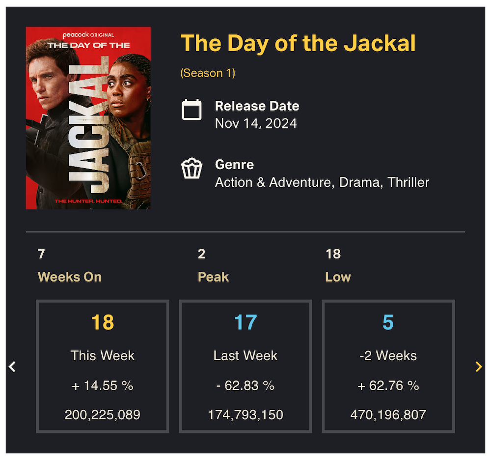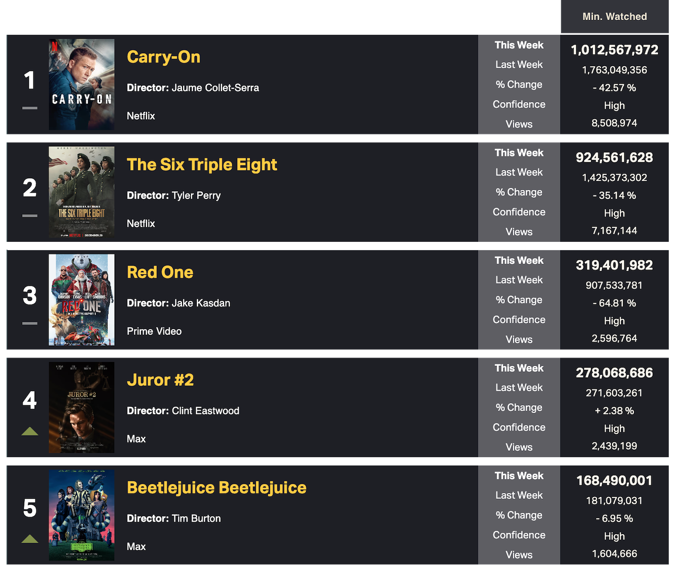Each week, we publish charts that rank the top 50 film and TV streaming originals by weekly viewership. Our charts include time watched, up/down trends, week-over-week changes and peak rankings for each entry.