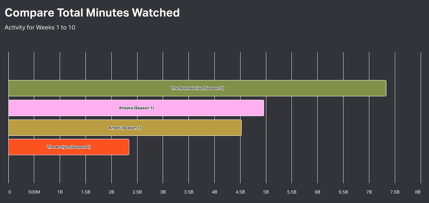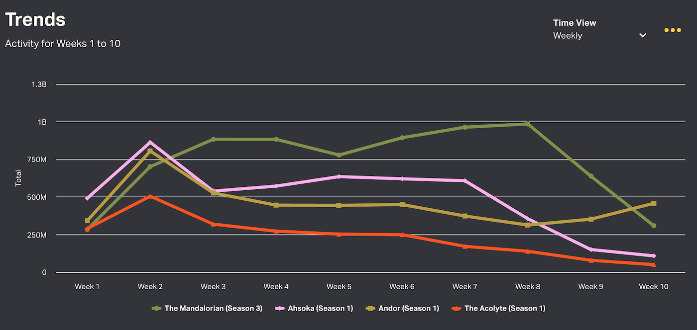 Note that if a title in a comparison has been available for less time than the others, total viewership could look misleading. For example, if a title has only been out for 5 weeks, a Weeks 1-26 comparison will include just 5 weeks’ worth of data for that title.