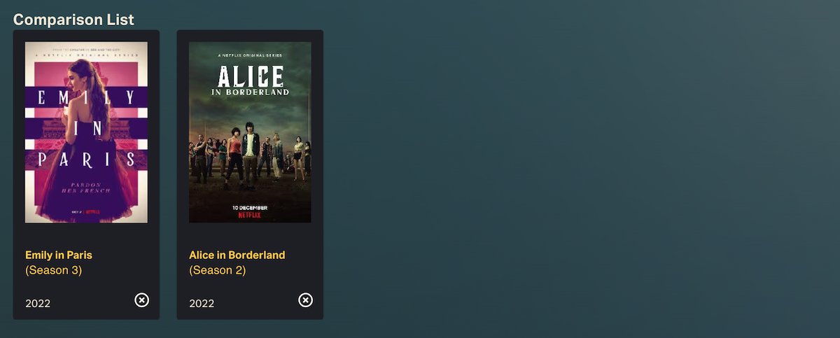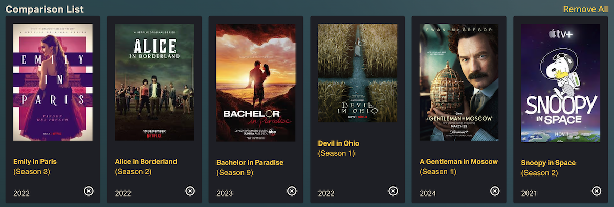 Start building your comparison by adding a TV show or movie. Search for specific titles or choose content from the Popular section below the search bar. Click the + button to add a title.