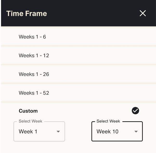 Comparison defaults to Weeks 1-6. Select one of the other presets from the Time Frame menu or set a custom range. Custom ranges can start after Week 1 of a title's release and end up to Week 52 (one year after release).