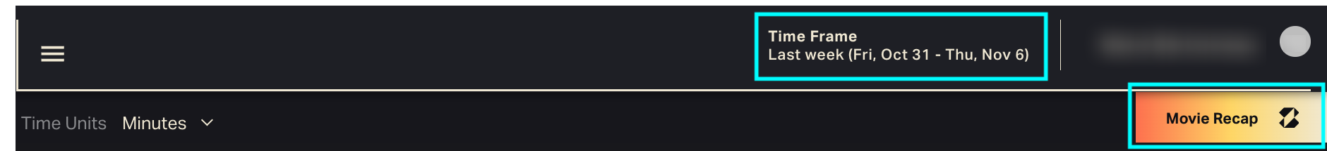 By default, SV(M) Dashboards show streaming results from the week in progress (Fri-Thu) in increments of Minutes Watched. Change Time Frame and Time Units to update data displays on the entire Dashboard.