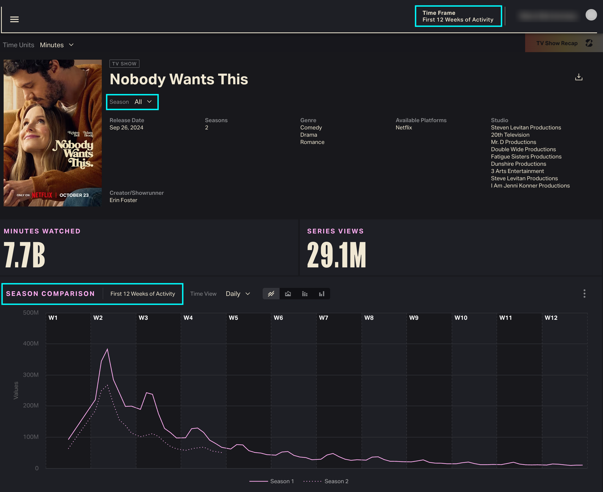 Dashboards combine topline information about TV shows and movies with key performance data and visuals. Use them to help contextualize streaming performance over time, by episode or by total views.