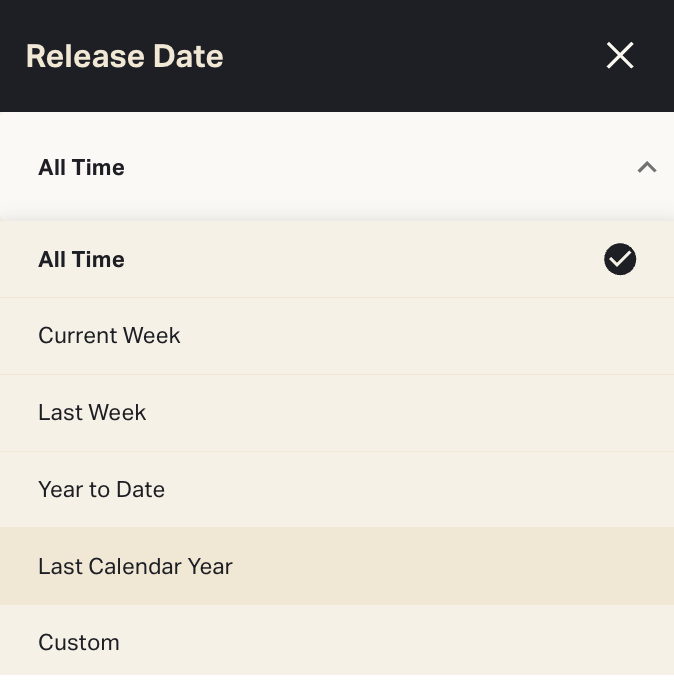 Genre selectionOpen the Genre pop-up to change the default selection from All.You can choose as many genres as you want to include.Some titles have more than one genre designation. Selecting a genre will include any title with that genre attached, even if it’s not the only one that applies. For example, choosing Animation will most likely include titles in Family, Kids and Comedy as well.Click DONE to close the menu with your genre selection applied.Platform selectionFilter by streaming platform availability.Setting platform filters will exclude titles that aren't available on any of those streamers during your selected time frame.NOTE: Just as several genres can apply to one title, many titles are available concurrently on more than one platform. The Platform filter captures "platform of origin" as well as "all other platforms that offer the title to stream."Source: Original or Non-OriginalChoose whether to include titles that are Original (streaming-first), Non-Original (library/licensed) or both.Release Date selectionFilter by release age to include only titles that were released within a specific date span. Click "All Time" to change the default.Choose a preset release age span from the dropdown or use the calendar tool to define custom date parameters. SV(M) supports release dates from 2022 onward. You cannot set a custom date range that starts or ends earlier than Week 1 of 2022.Release Date filtering does not change the Time Frame for your report (and vice versa). You can rank titles released last year (Release Date) based on their performance last week (Time Frame), titles released this month based on performance this month, and so on.Setting a Time Frame that ends before your Release Date span begins will generate a blank report. SV(M) cannot display views from last year for titles that were released last week, for instance.