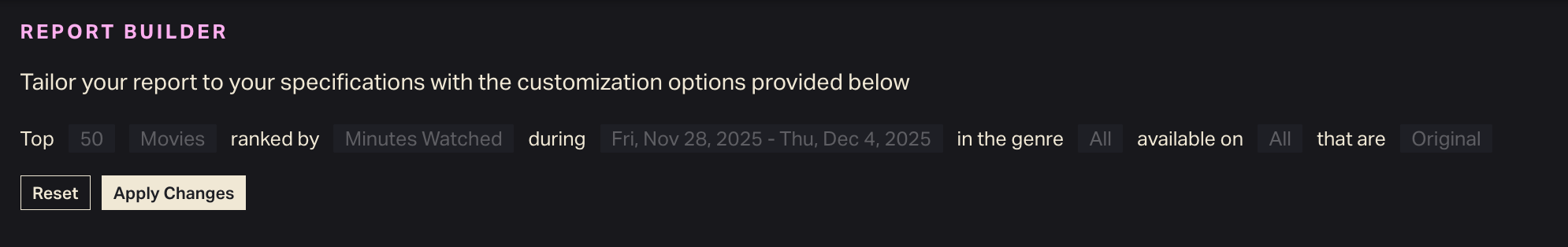 The next fields indicate title category (TV Shows or Movies) and how to rank them. You can rank titles by minutes watched (default) or by number of views.